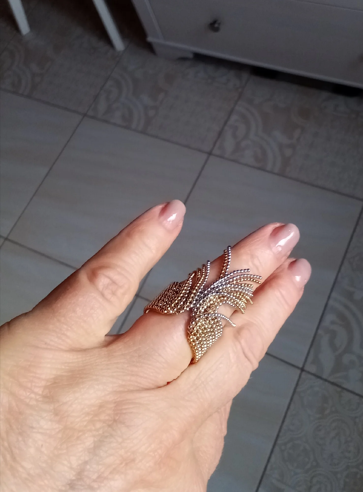 Très belle bague, je suis vraiment ravie. La finition est soignée et elle fait tout de suite son effet une fois portée. On sent que le bijou est bien travaillé et de bonne qualité. Je recommande sans hésiter.