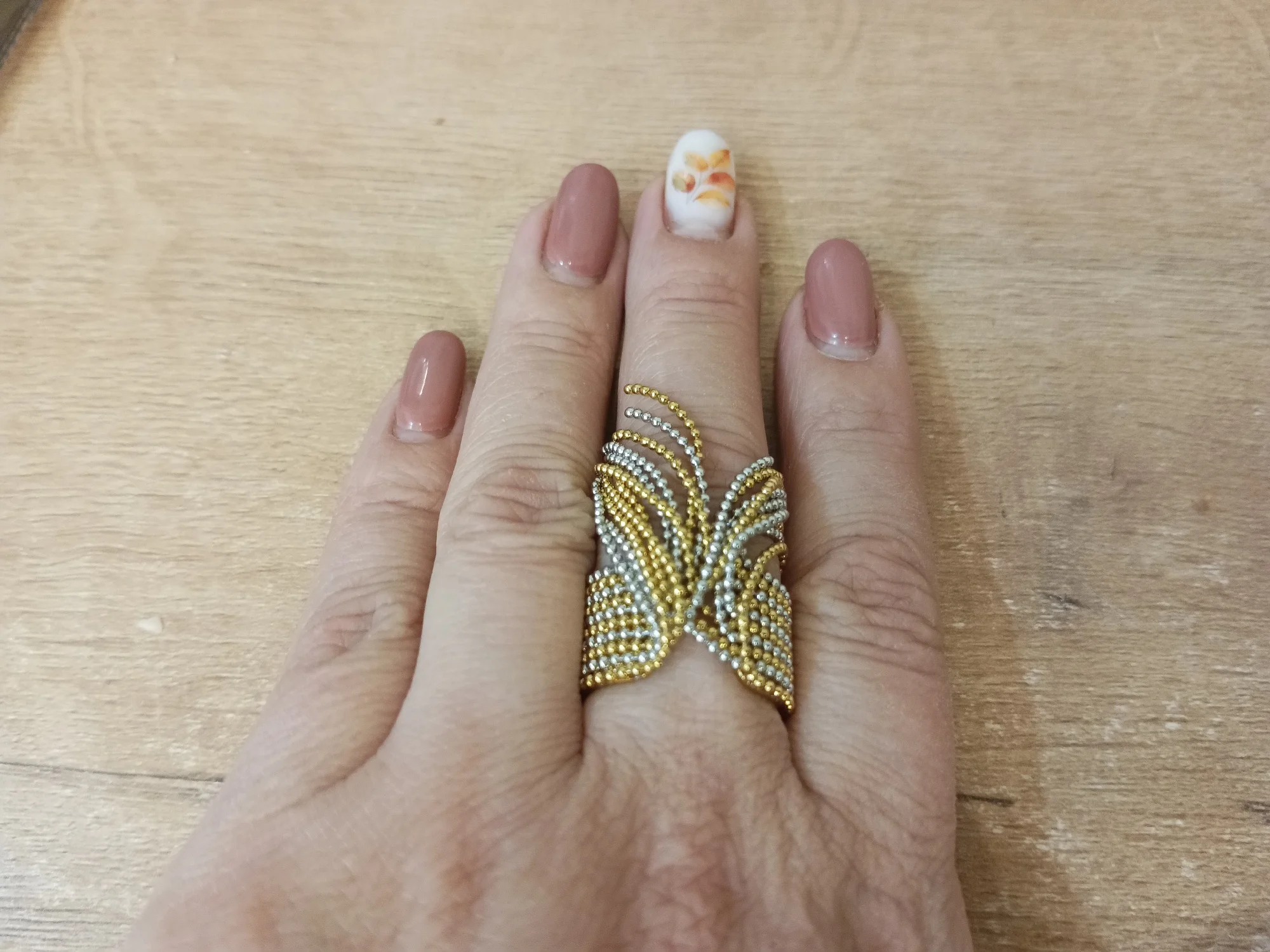 La bague est arrivée rapidement et bien emballée dans un petit sachet. Je l’ai achetée en même temps que des boucles d’oreilles et l’ensemble est très joli. La qualité est bonne. Elle est un peu plus large que ce que j’imaginais (environ 1,2 cm), mais au final elle reste agréable à porter sur ma main. Taille réglable pratique.