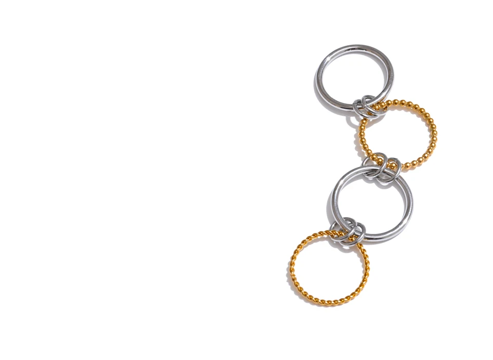 Le design des Bagues acier inoxydable repose sur des anneaux liés. Les formes sont rondes. Le jeu de couleurs crée du contraste. Doré et argent se répondent. Le bijou capte la lumière. Il reste fin et équilibré.