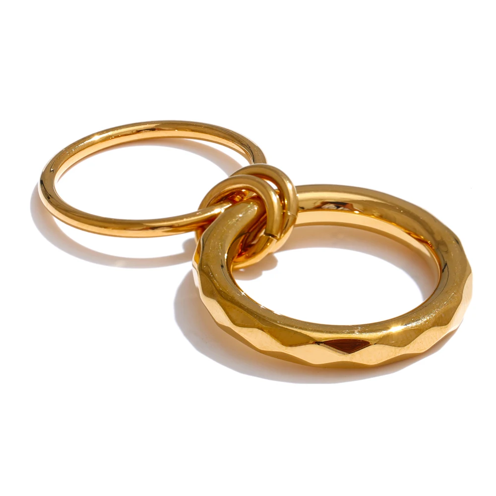 Le design de ces bagues dorées acier inoxydable s’inspire d’une esthétique brute et élégante à la fois. Les anneaux entrelacés créent un jeu de volumes subtil, avec une surface légèrement texturée qui capte la lumière sans excès. Ce contraste apporte du caractère, tout en restant facile à assortir avec d’autres bijoux.