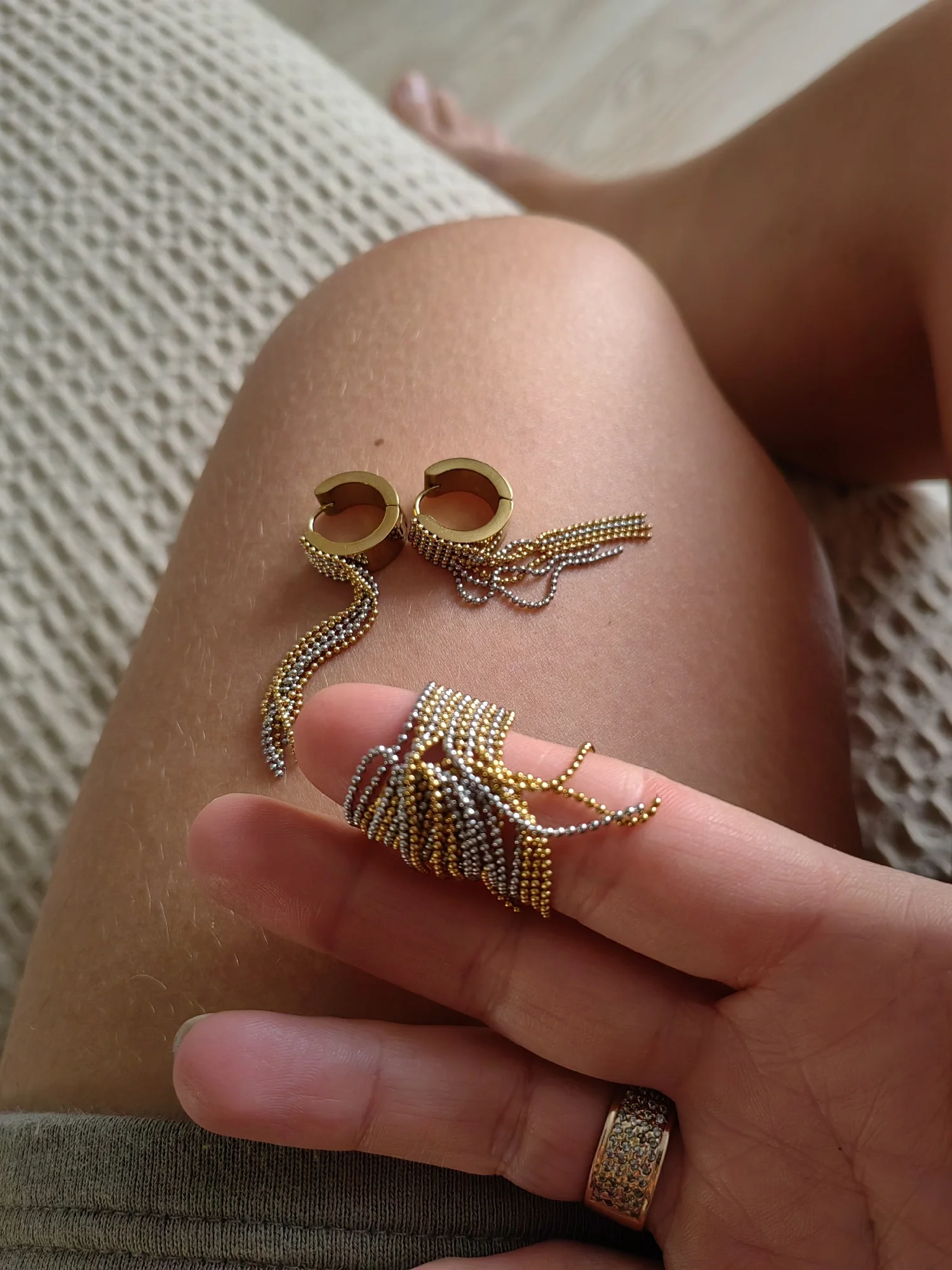 Le design de ces boucles repose sur un jeu de perles dorées et argentées qui s’entrelacent et descendent en cascades souples. Cet effet visuel apporte de la profondeur et du relief sans alourdir l’ensemble. Les lignes restent fines, ce qui donne une impression de légèreté et de mouvement. Portées avec les cheveux attachés ou lâchés, elles captent la lumière et soulignent le visage avec une élégance discrète. C’est un style qui fonctionne aussi bien en journée qu’en soirée, sans jamais sembler excessif.