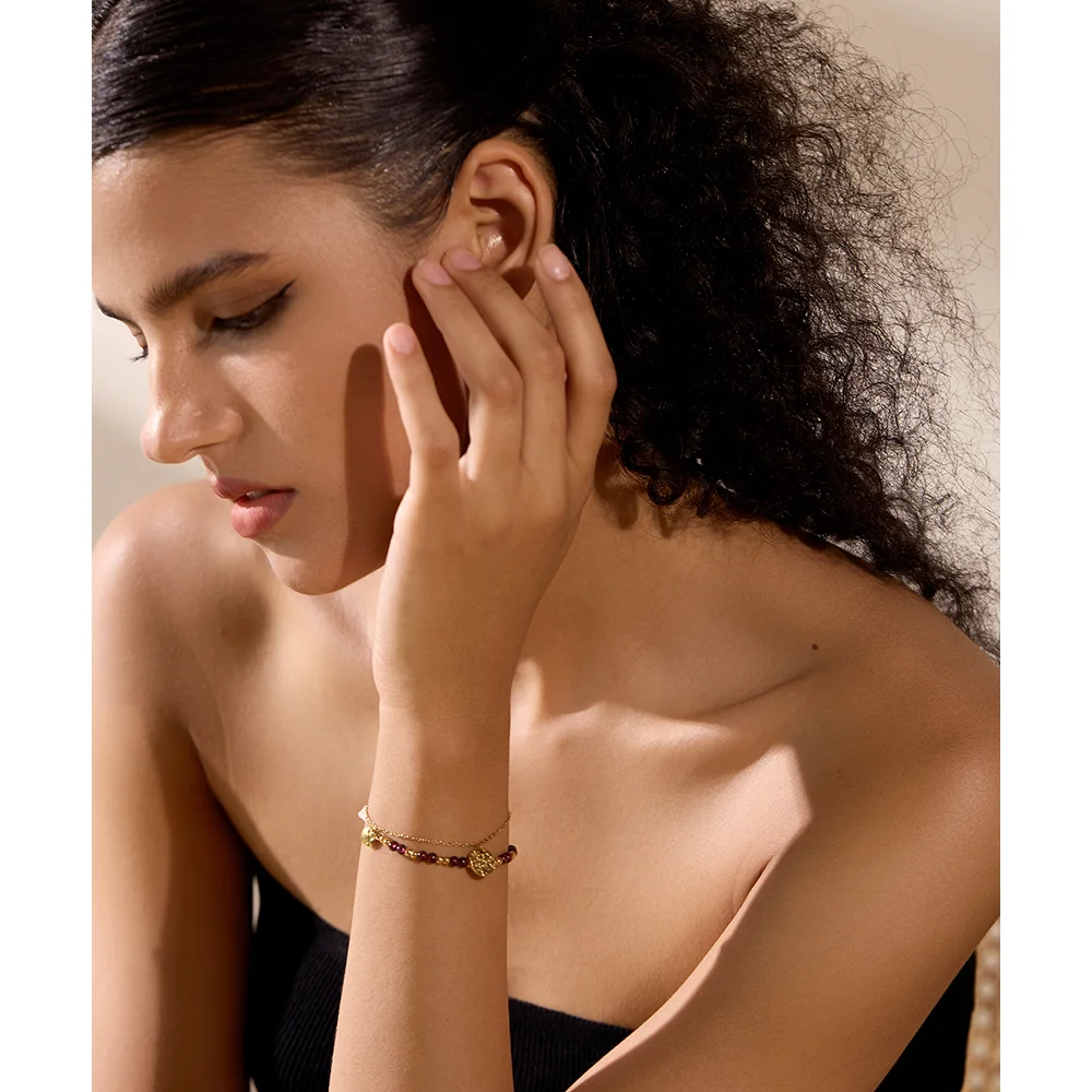 Le bracelet de cheville acier inoxydable présenté ici se distingue par une composition harmonieuse. Les perles de grenat apportent une touche de couleur profonde et chaleureuse, tandis que les éléments métalliques dorés créent un contraste raffiné. La double chaîne renforce l’aspect visuel tout en assurant une bonne tenue autour de la cheville. Ce design reste discret mais suffisamment travaillé pour attirer l’œil sans jamais paraître excessif.