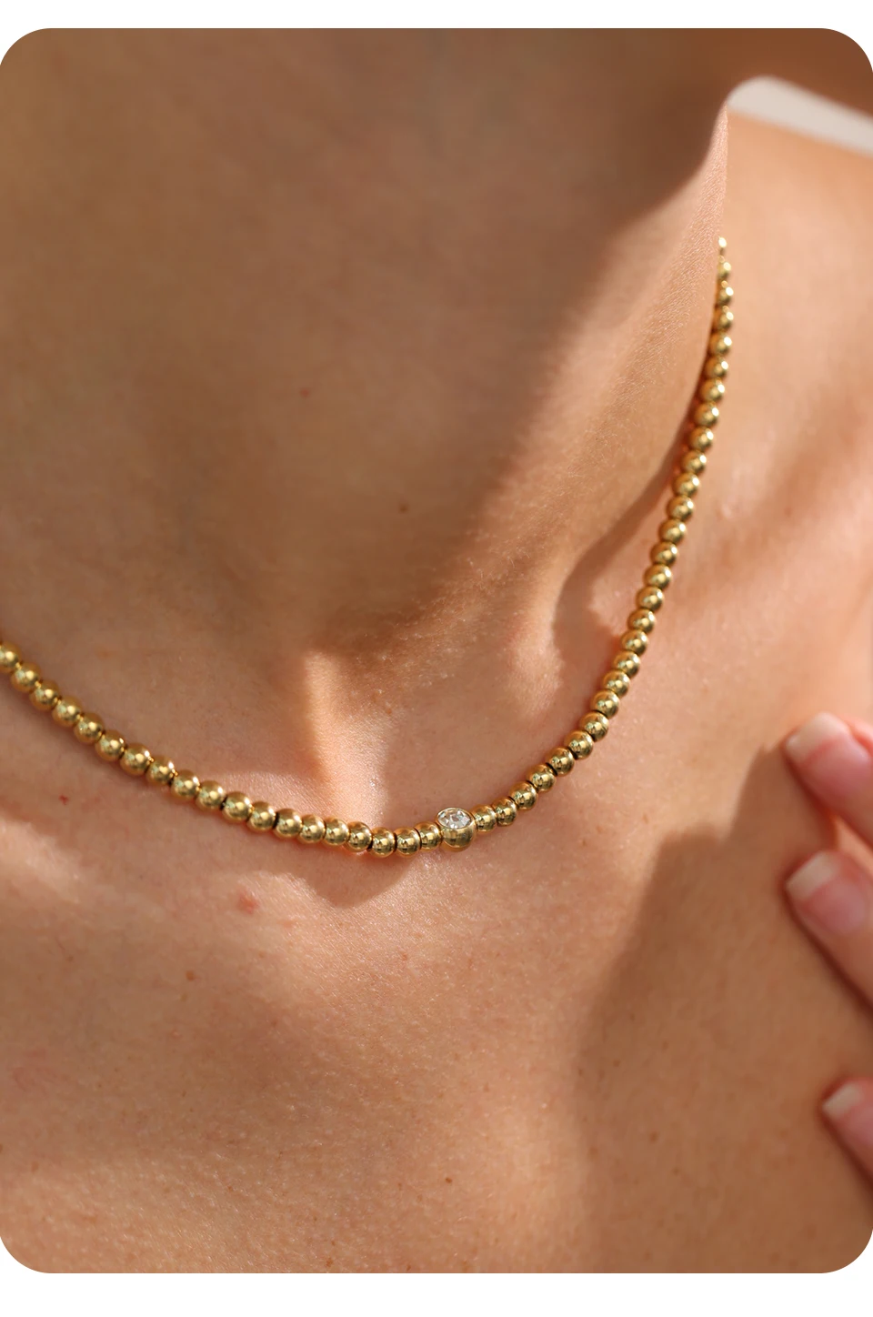 Le design de ce collier repose sur une ligne de perles dorées, régulières et brillantes. Chaque perle est travaillée pour offrir une surface lisse et réfléchissante. Le résultat est net, moderne et très visuel. Une pierre en zircone cubique vient subtilement apporter un point de lumière supplémentaire, sans casser l’harmonie de l’ensemble.
