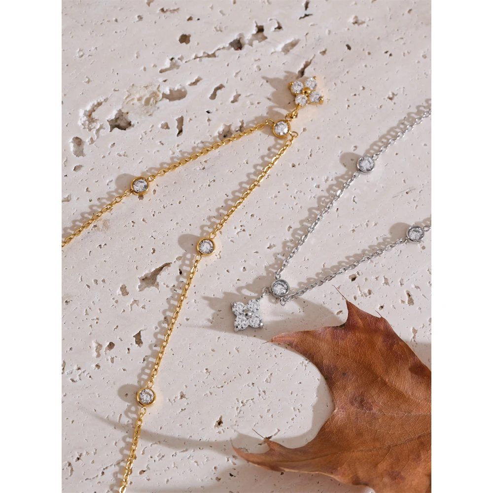 Le design est inspiré de la simplicité élégante. La chaîne est fine. Elle est décorée de pierres rondes bien réparties. Au centre, un pendentif délicat attire le regard. Les pierres en zircone cubique offrent un éclat cristallin. La lumière se reflète à chaque mouvement. Le rendu est doux. Jamais excessif.