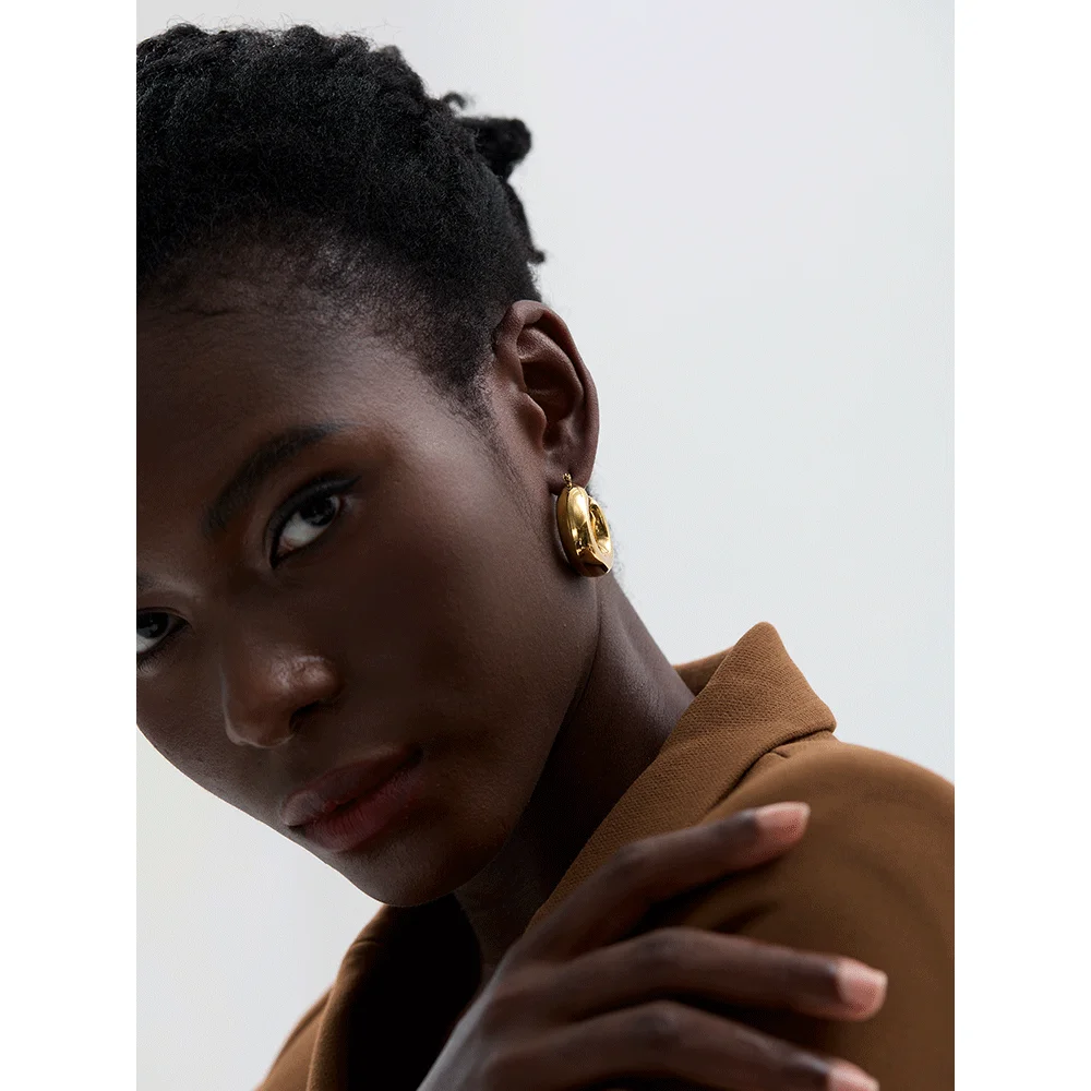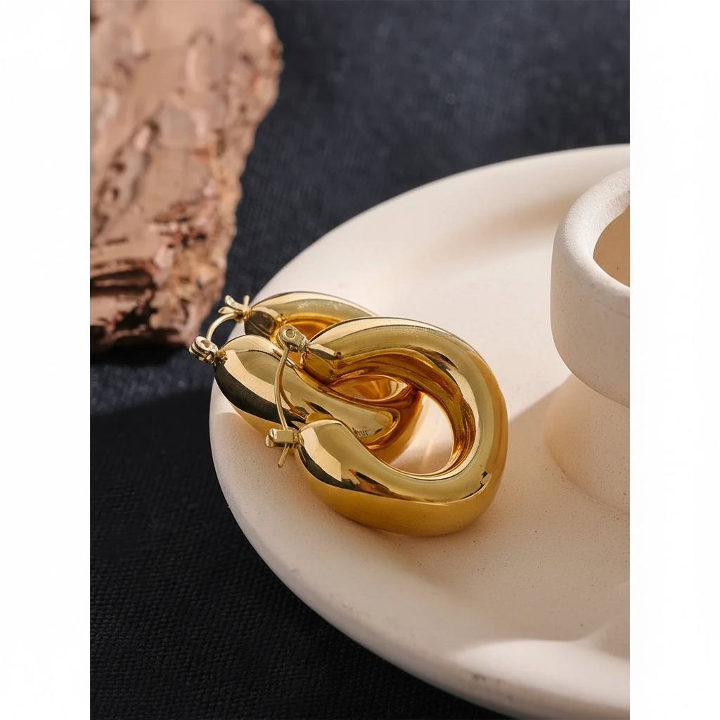 Le design de ces créoles repose sur des courbes épaisses et harmonieuses. Leur forme légèrement arrondie donne du relief et capte la lumière à chaque mouvement. Avec une hauteur de 30 mm et une largeur de 27 mm, elles offrent une taille idéale pour être remarquées sans alourdir le visage. Les créoles dorées acier inoxydable créent un effet visuel fort, tout en restant confortables grâce à une répartition équilibrée du poids.