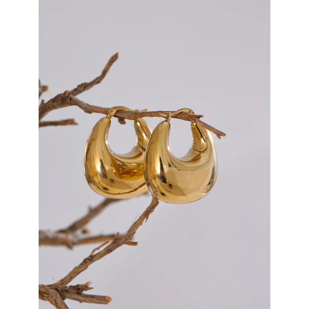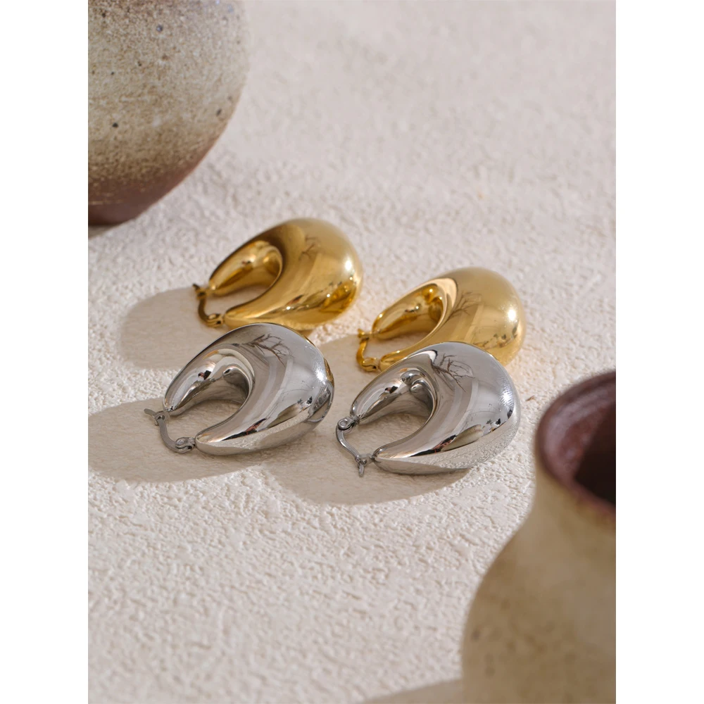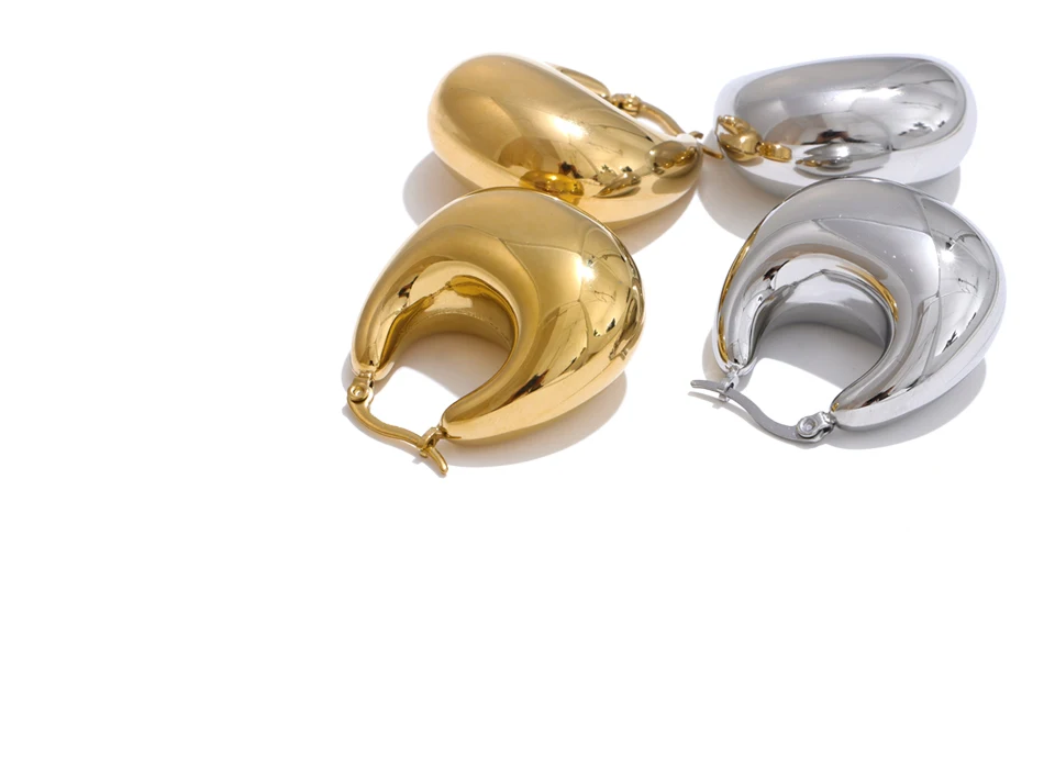 Le design de ces créoles épaisses acier inoxydable se distingue par des lignes arrondies et généreuses. Leur forme bombée crée un effet miroir subtil qui attire le regard sans être agressif. La hauteur de 33 mm et la largeur de 30 mm offrent un équilibre parfait entre visibilité et élégance.