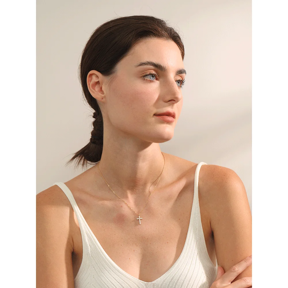 La croix est un symbole ancien et universel. Ici, elle est revisitée avec finesse. Les zircones cubiques sont alignées avec précision. Leur couleur cristalline capte bien la lumière.